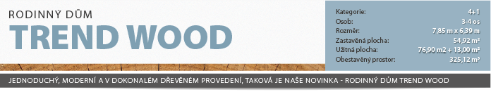 Jednoduchý a přesto moderní, takový je náš nabízený nejmenší rodinný dům TREND WOOD. Dům, který byl tvořen s ohledem na současné potřeby mladých, začínajících rodin, které chtějí bydlet ve svém i třeba malém, ale moderním a pěkném rodinném domu se základním požadavkem nestarat se a užívat si společného rodinného života. TREND WOOD Vám poskytne na opravdu minimální zastavěné ploše, necelých 55 m2, maximální užitnou plochu, svou částečně prosklenou fasádou 1.NP dochází k propojení vnitřního prostoru rodinného domu se zahradou což hlavně v letních obdobích poskytne všem členům vaší rodiny dostatek prostoru pro aktivní život a to nejen v rodinném domě. Zahrada se stane součástí vašeho bydlení.