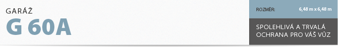 Zděná garáž pro 2 osobní automobily čtvercového půdorysného tvaru o rozměrech 6,48 m x 6,48 m, garáž je založena na betonových obvodových základových pasech a železobetonové desce. Obvodové zdivo z keramických (POROTHERM, HELUZ), nebo pěnosilikátových (YTONG, HEBEL) tvárnic dle volby klienta tl. 300 mm. Svislé konstrukce jsou izolovány proti zemní vlhkosti, dle požadavku klienta i proti radonu. Objekt je zastřešen sedlovou střechou s použitím vodotěsného podstřeší a použitím skládané střešní krytiny. Střešní konstrukce jsou tepelně izolovány. Vnitřní povrchová úprava garáže je provedena tenkovrstvými štukovými omítkami s následnou malbou v odstínu bílé, povrchová úprava podlahy – epoxidový nátěr (voděodolný, otěruodolný) s ukončením na svislých stěnách ve výšce 150 mm, vnější povrchová úprava svislých konstrukcí bez zateplení s použitím probarvené fasádní omítky. Garážová vrata plechová, nezateplená, výklopná 2x. Klempířské konstrukce projektovány z TiZn plechu. Okenní výplně plastové. V garáži osazena 1xelektrorozvodnice, zásuvky 2x380V a 4x220V, osvětlení 6x nástěnné zářivkové tělesa, objekt je nevytápěný.
